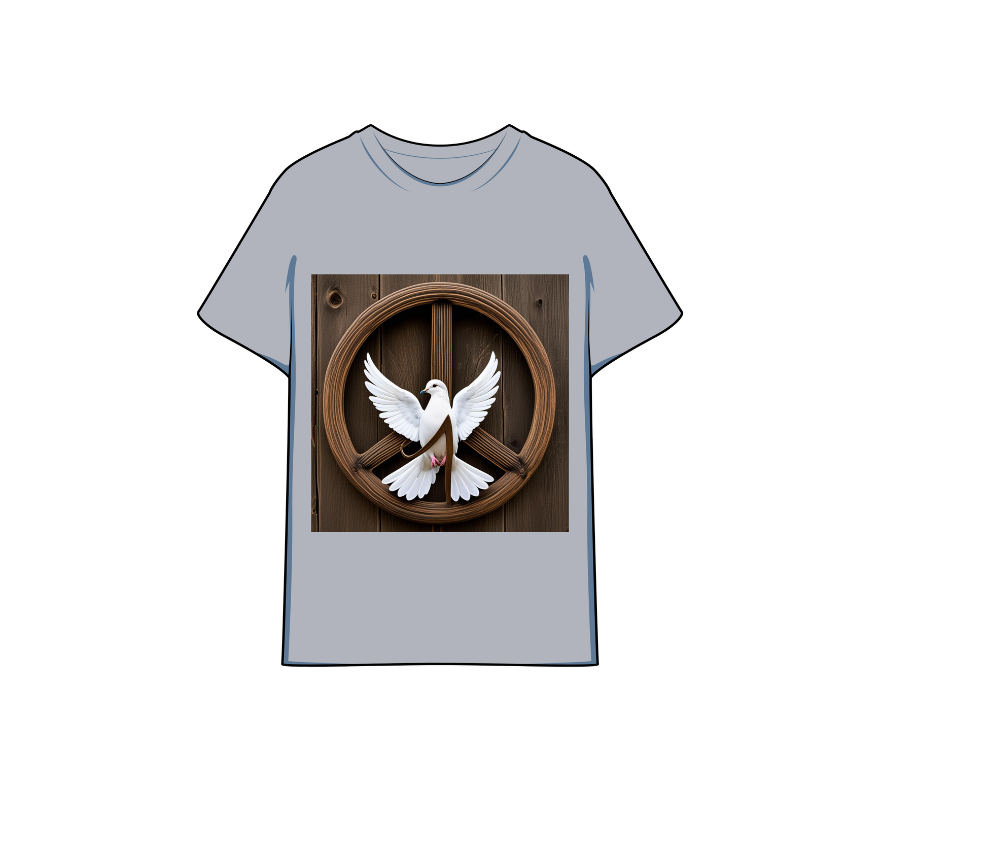 This T-shirt features a compelling design combining the dove and peace sign, universally recognized symbols of peace and humanity. Crafted for comfort and durability, it allows you to express your commitment to harmony and compassion in style. Perfect for those who value meaningful messaging and quality wear.