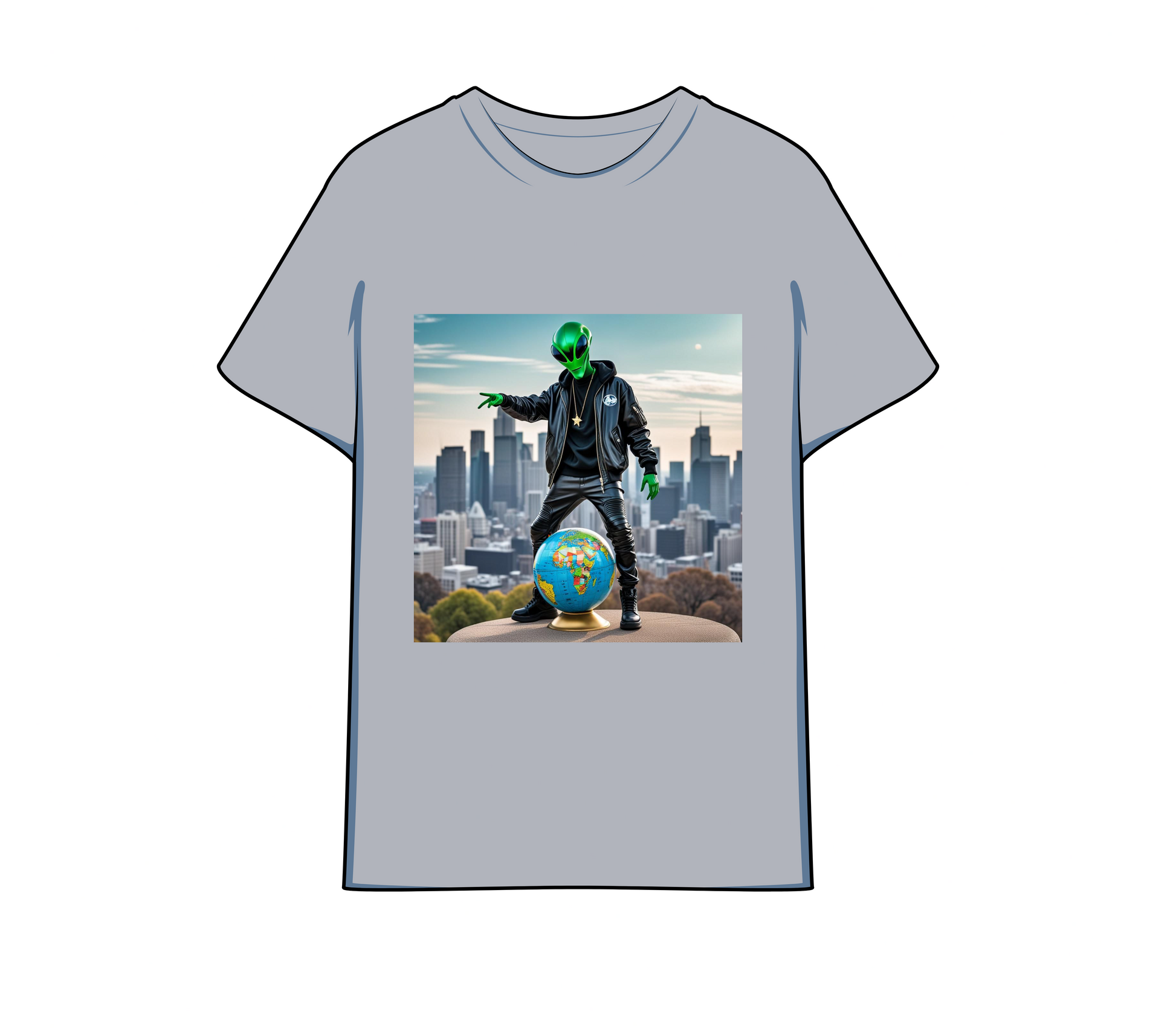 This T-shirt showcases a unique design featuring an alien rapper, blending extraterrestrial coolness with urban style. Crafted for those who appreciate bold, imaginative fashion, it offers a stylish way to express individuality and a love for creative culture. Perfect for casual wear, it combines comfort with standout graphics that make a confident statement.